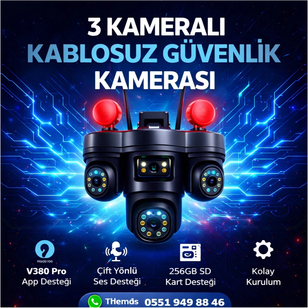 Arna 3 kameralı PTZ kablosuz wifi güvenlik kamerası her biri ayrı ayrı hareket edebilen 3 kamerası ile estetik görünüşe ve kör nokta bırakmadan görüntü almanın keyfini yaşatır. İstenilirse 3 kamera tek ekranda izlenebileceği gibi tek ekradan tek kamerasını da izleyebilirsiniz. 256 GB Micro SD kart desteği ile uzun zamanlı kayıt alma imkanı bulunmaktadır. İnsan algılama , yıldırım koruması gibi ek özelliklerle donatılmış olan kablosuz wifi güvenlik kamerası modelimiz IP67 waterproof özellikte olup dış mekan hava şartlarına karşı dayanıklıdır.