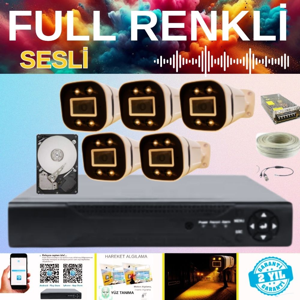 5 ADET 5 MP 4 ATOM WARM LED SESLİ WATERPROOF IŞIKLI GECE RENKLİ AHD BULLET GÜVENLİK KAMERASI